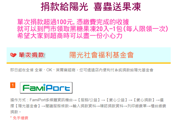 單次捐款超過100元,憑繳費完成的收據 就可以到門市領取黑糖果凍20入-1包(每人限領一次)領取期間:6/30~7/31希望大家到超商時可以盡一份小心力 新莊店:新北市新莊區中正路437號 三重店:新北市三重區重陽路二段19巷15號