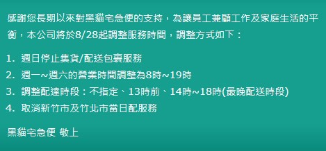 配合黑貓公告-8/26後,周日無法出貨與到貨