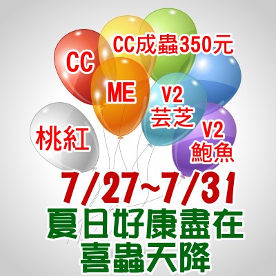 1.桃紅鍬形蟲-成蟲-5折優惠中(單公)售完為止2.毛大象ME-成蟲,7市自取7折優惠中3.CC幼蟲 買二送一4.V2鮑魚 門市優惠買二送一5.芸芝 門市優惠買二送一