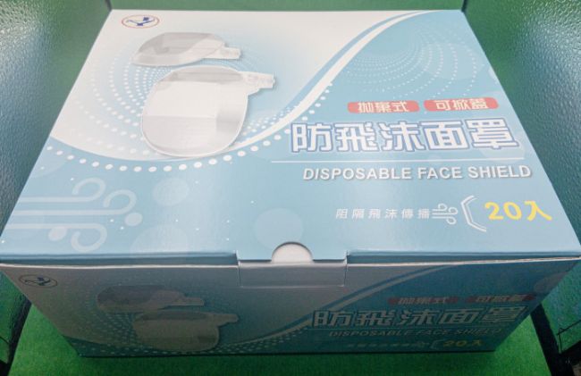 PET抗靜電材質,很輕,可長時間配戴,拋棄式防飛沫面罩