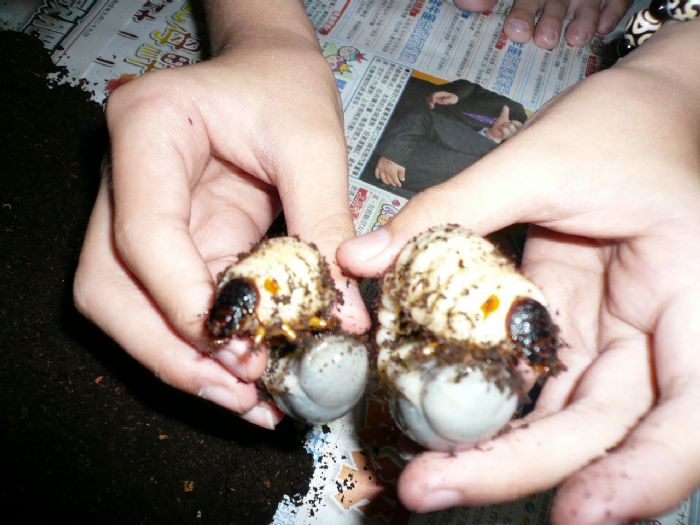 這張給你看!所看見的是我養的獨角仙幼蟲.. 體型不一樣.當時是一起脫皮.同樣一起樣在那個飼育箱. 結果有一隻好像縮水.而另一隻則日漸增大. 所以是公母嗎?我覺得應該是吧!!! |