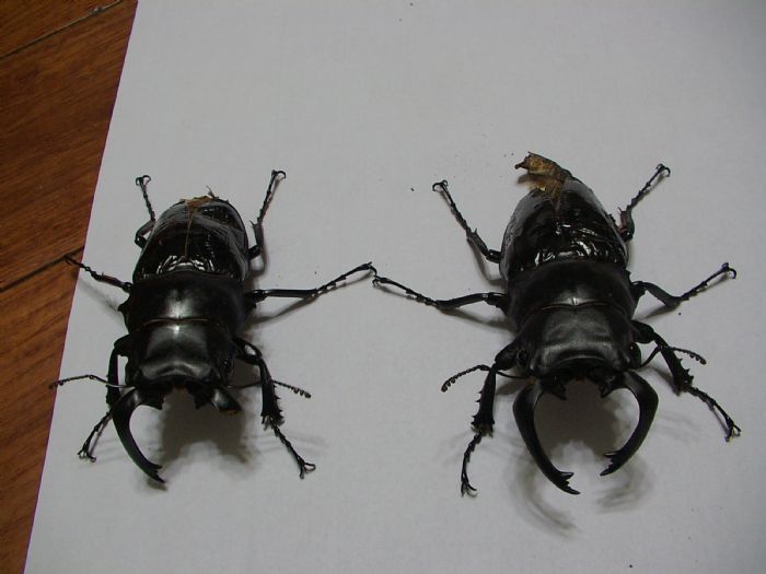 如相片,左邊是先出蛹室的長牙,大顎已折損了一隻,右邊是後出蛹室的長牙,大顎不對稱 |
