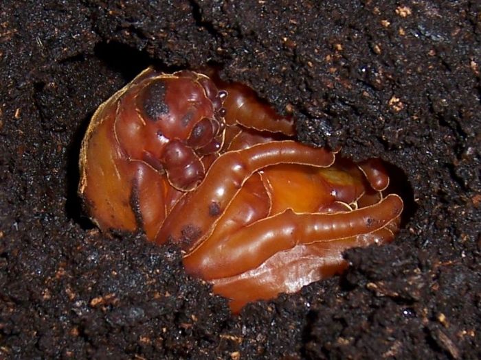 請教老師 情況是:就在這兩天我正要換土 一層層向下移除時感覺底層略有結塊 不疑是蛹室已經形成. 無意中挖破了蛹室 看到成蛹的大兜 原來真是長這般模樣 看牠像嬰兒般翻動 好生歡喜. 趕緊拍下照片 隨即又輕灑覆上幾公分的土 再噴些許的水 蓋上防蟲網 靜置高處. 擔心是: 1.我會不會誤傷了蟲兒? 2.破了蛹室後的處置可以嗎 若有不良 如何善後? 3.多久會成蟲自己爬出來? 4~5公分的土會不會太厚而出不來! 4.成蛹期間如何照護 仍保持同樣噴水嗎? 5.若順利長大成人(蟲) 再來要怎麼養 例如餵食果凍? 6.好像壽命僅有幾個月 該何時相親 幫牠找伴侶傳宗接代! 真不好意思 囉唆這麼多 當我完成這一個生命週期的循環 我就有一輪的經驗了 謝謝 |