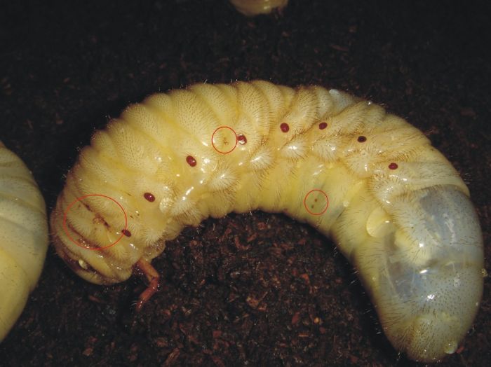 請教一下醫生 圖中圈起來的部份,是不是就是紅蹣,他到底對幼蟲及成蟲會有什麼樣的傷害,我從大概2齡時就發現了,一直到現在也持續成長,目前最大的 41g,今天心血來潮把所有的幼蟲抓到洗手檯去沖水即用毛筆刷,但還是有一些躲起來,洗不掉,沖水會不會掛掉阿?謝謝! |