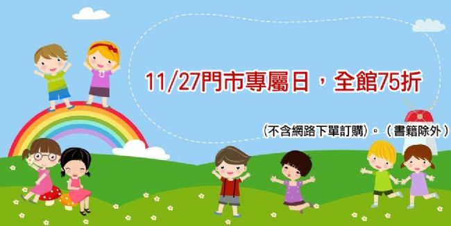 11/27門市專屬日,全館75折(不含網路下單訂購)。(書籍除外)